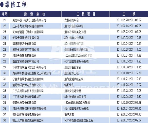 宏順建設工程有限公司是國家批準成立的專業高空作業企業:承攬過(國內.國外)煙囪新建、煙囪防腐、磚煙囪新建、煙囪改造、煙囪維修、煙囪脫硫防腐、煙囪拆除加高、煙囪滑膜等高空作業工程。具有“不搭腳手架 、 不需要停產”施工特點。